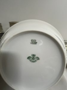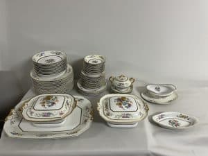 10 – soup plates – size – 19 cm   12 – dinner plates – size –                                   4 – salad plates – size – 20 cm.  2 – open vegetable dish – size – 26 cm.            1 – gravy boat bowl atachd underplate – size – 19 cm                                             11 – side plates – size – 20 cm.  1 – vegetable plate – size – 23.5 cm.                    1 – serving plate – size – 42 cm.        1 soup plate small chip 1 side plate small chip                                                                                                                                65 PCS total C $2100